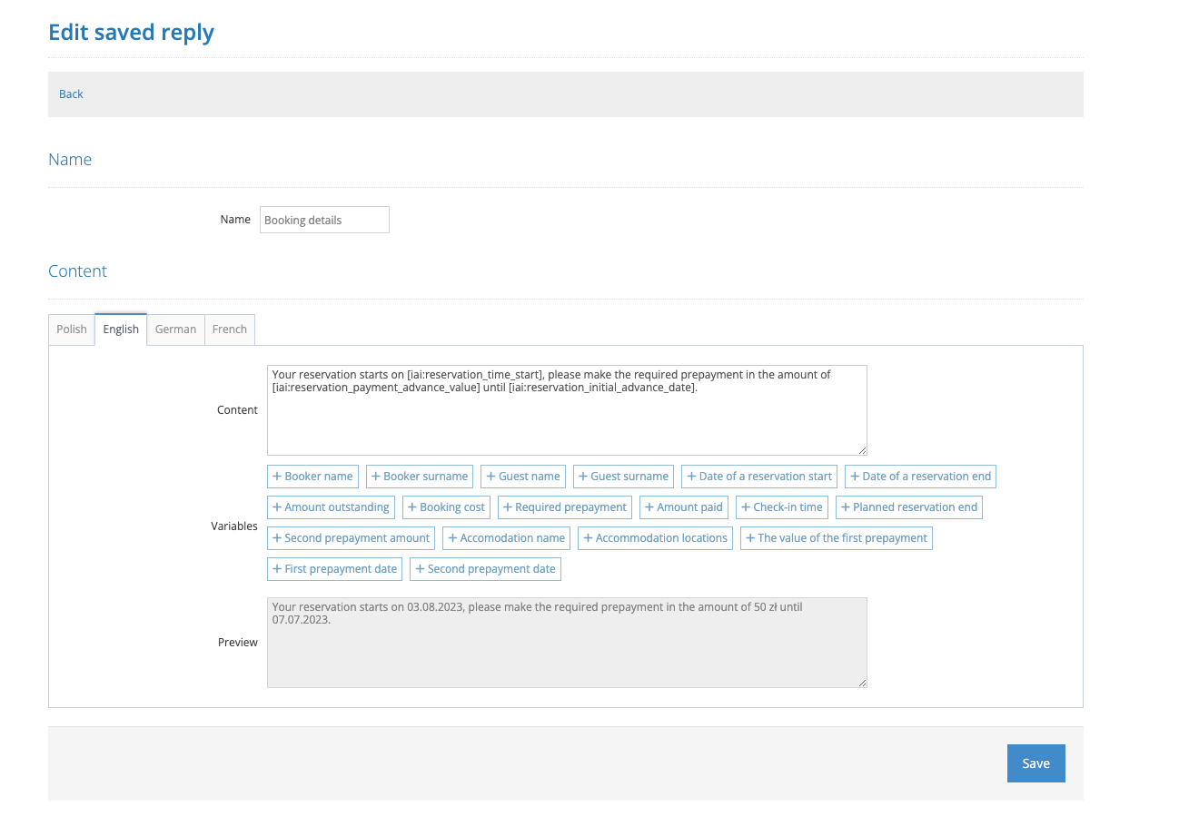 It is also possible to set up message templates to speed up the process of replying for all frequently asked questions. Each such message, together with all emails automatically sent by the system, will now be visible in the "Messages" tab. While responding to a client, you can select a quick reply from the list and instantly send it to the guest. Templates are created by simply selecting variables and entering your own content.