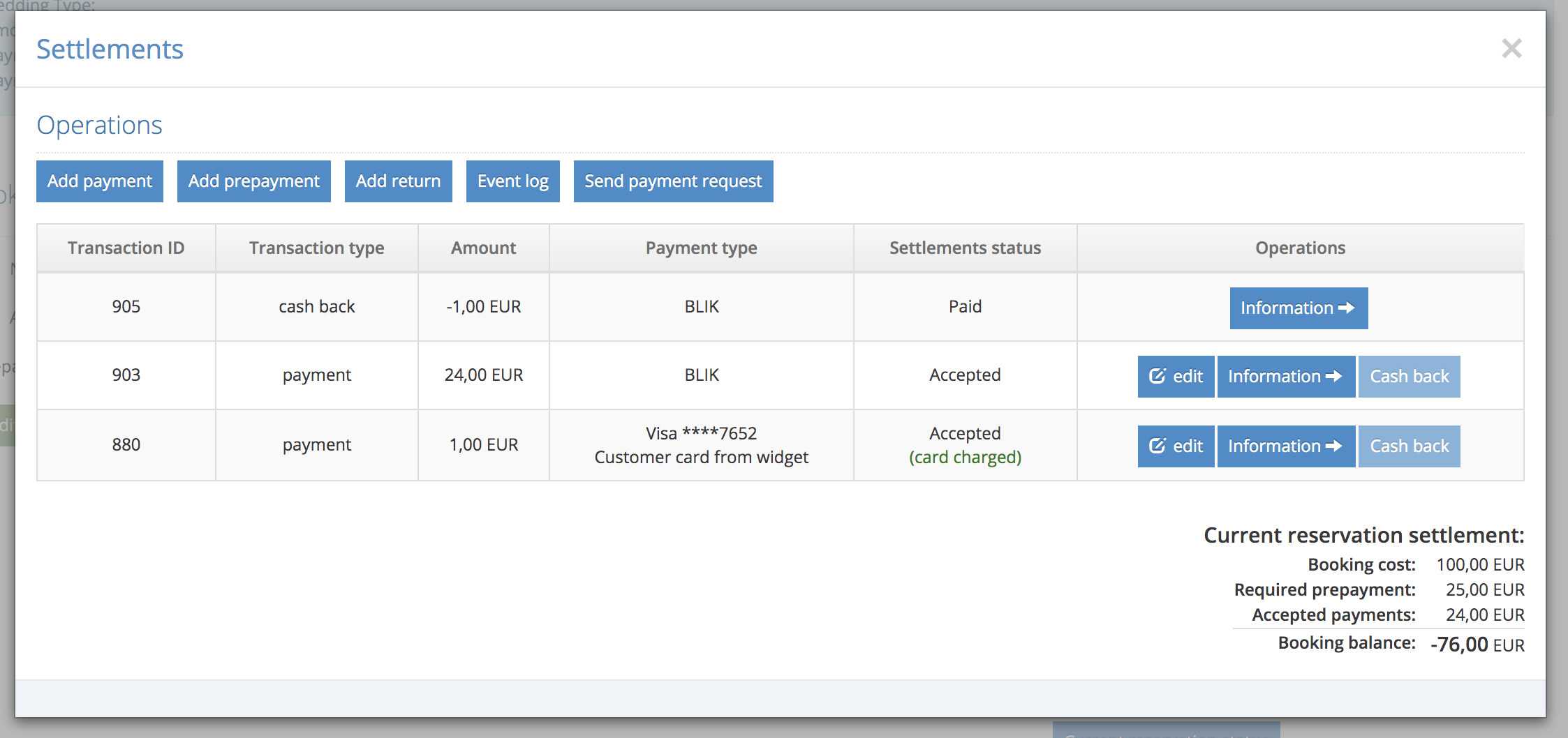 IdoPay now allows you to return funds from payments made via BLIK (which is a very popular payment method in Poland). Returns can be made from the reservation level, directly to bank account with just one click. To make a refund from a BLIK transaction via IdoPay, all you have to do is go to a reservation card and click on the 'Cash back' link next to the payment you want to return. You can also make partial refunds. The amount of the refund will be transferred from your deposit balance directly to your customer's bank account and will be visible as a BLIK refund.