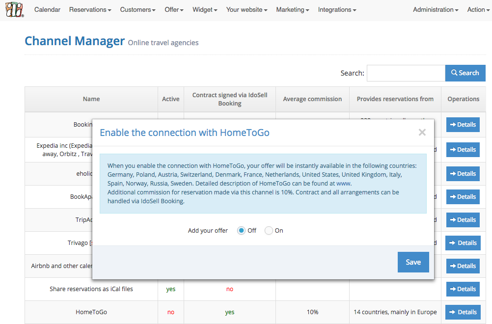 All you need to do to display your offer in HomeToGo is go to INTEGRATIONS/[/en/booking/functions/channel-manager/ Channel Manager] in your admin panel and click on Details next to HometoGo. Your offer with current availability and rates will be automatically displayed after enabling the connection.