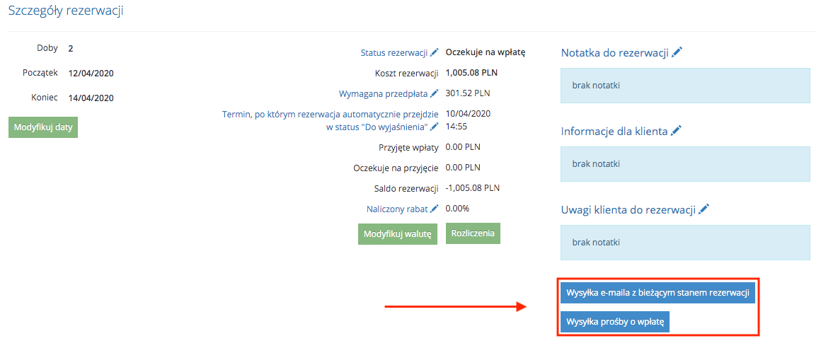 - Wysyłka prośby o wpłatę (po kliknięciu na przycisk w rezerwacji)