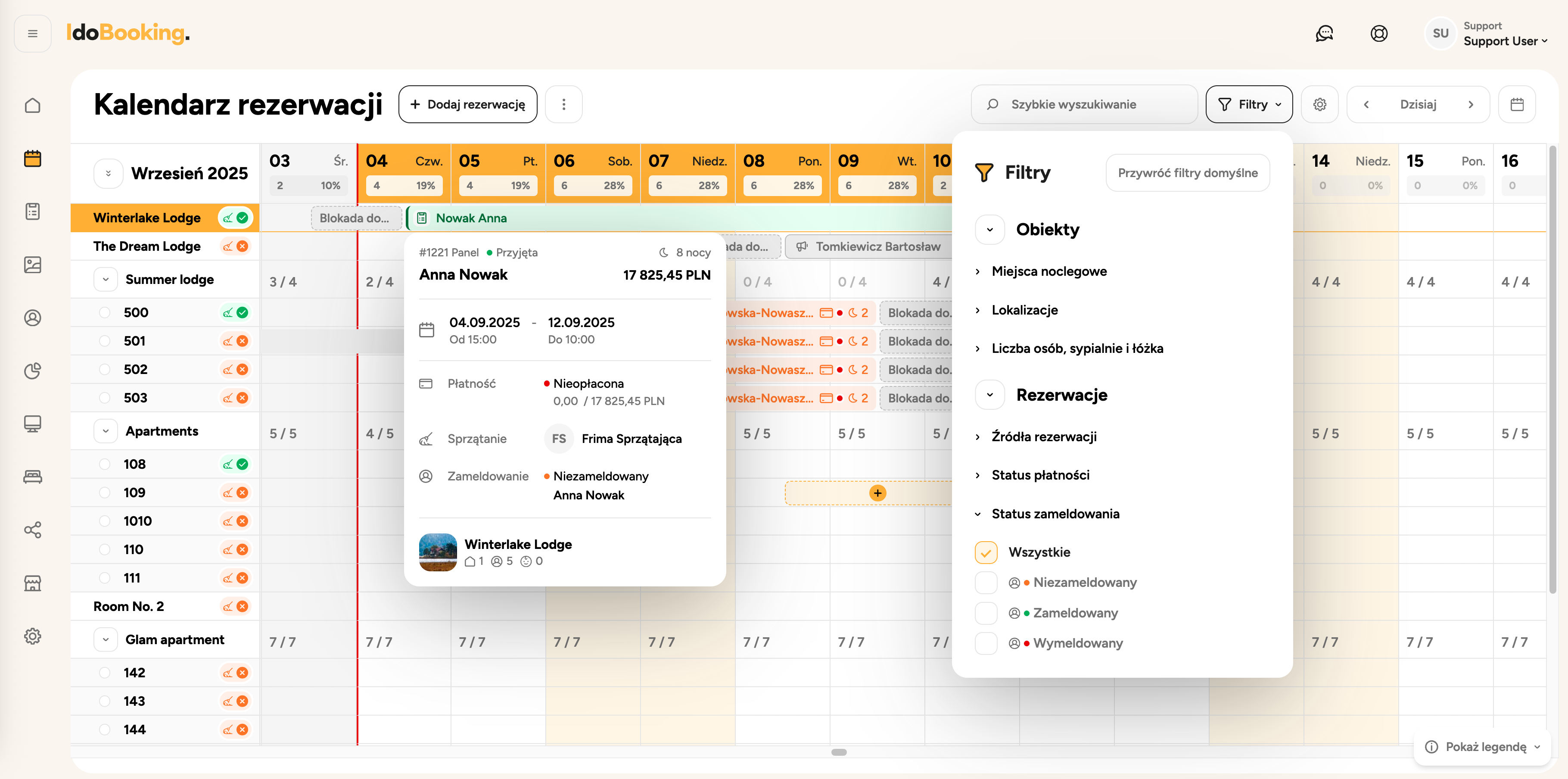 Dedykowane widoki kalendarza dla ekipy sprzątającej i właścicieli: oznaczanie statusu posprzątania pokoi, wyświetlanie osób przypisanych do sprzątania, czytelniejsze informacje o datach pobytu i liczbie osób w kalendarzach ekip sprzątajacych