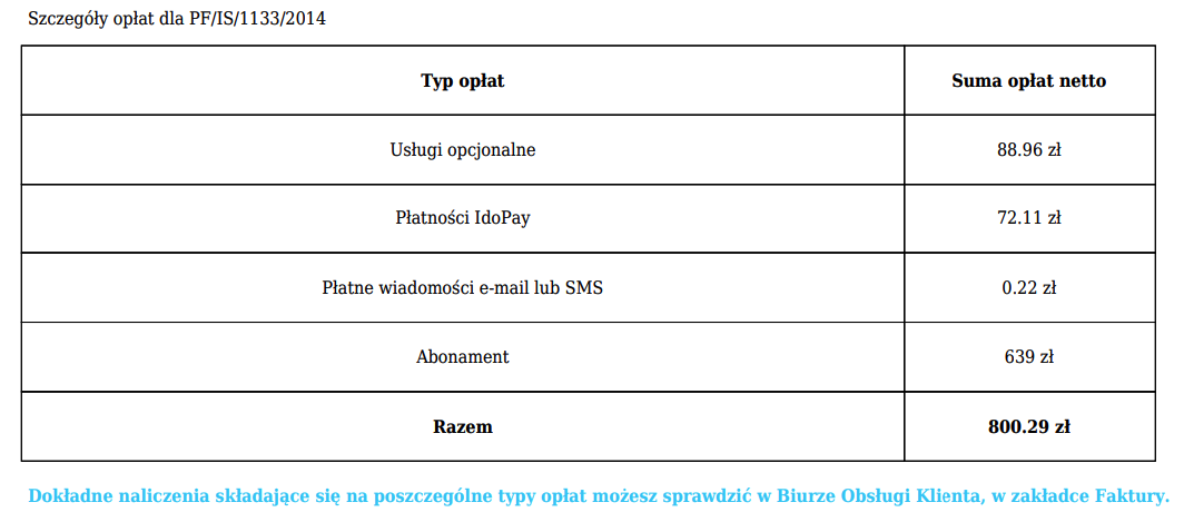 Na drugiej stronie faktury umieściliśmy podsumowanie poszczególnych grup usług, które składają się na fakturę. Podsumowanie to w przystępny sposób pozwala na sprawdzenie np. ile wyniósł sam abonament, ile prowizje za płatności IdoPay, a ile nadania przesyłek IdoSell Broker.