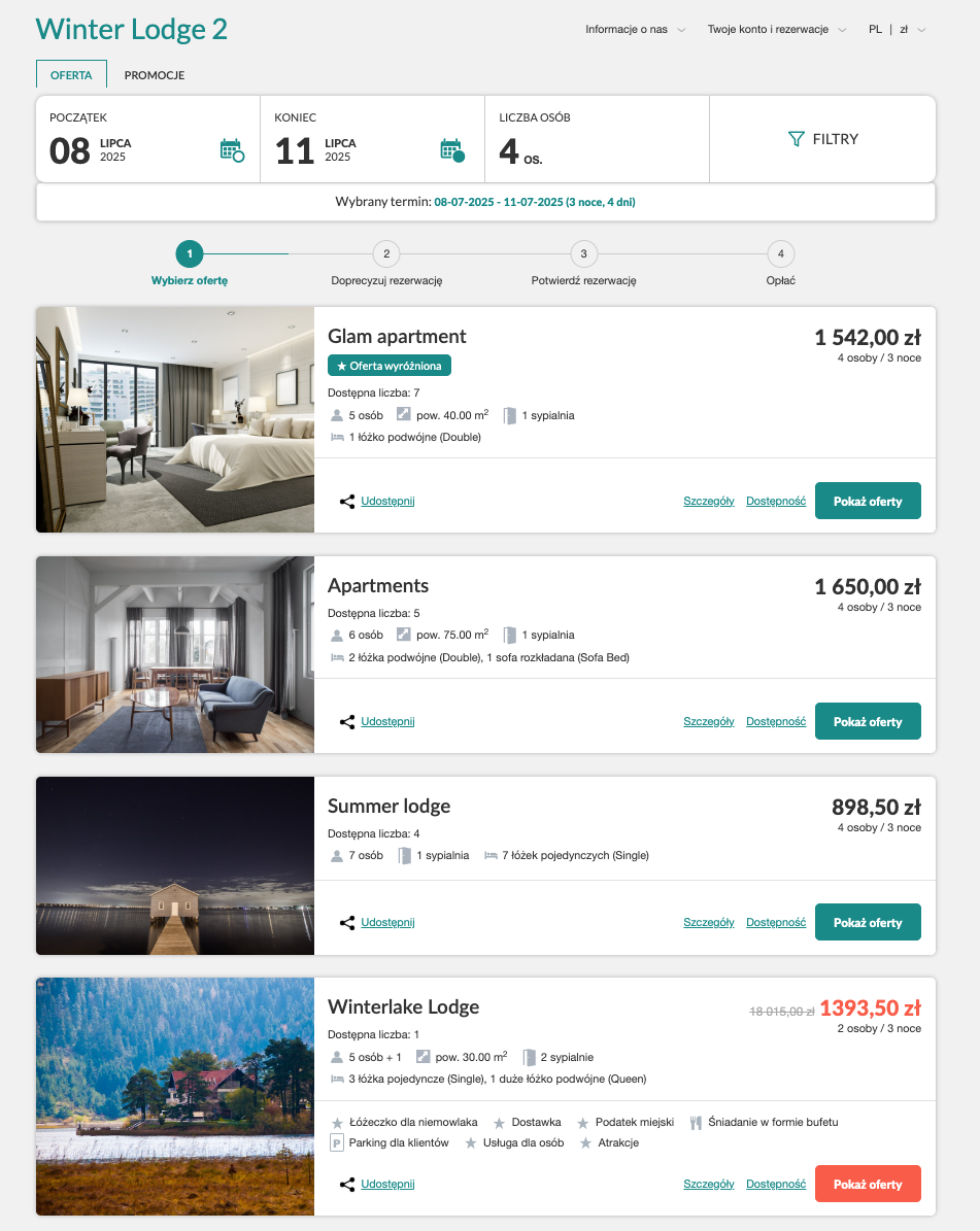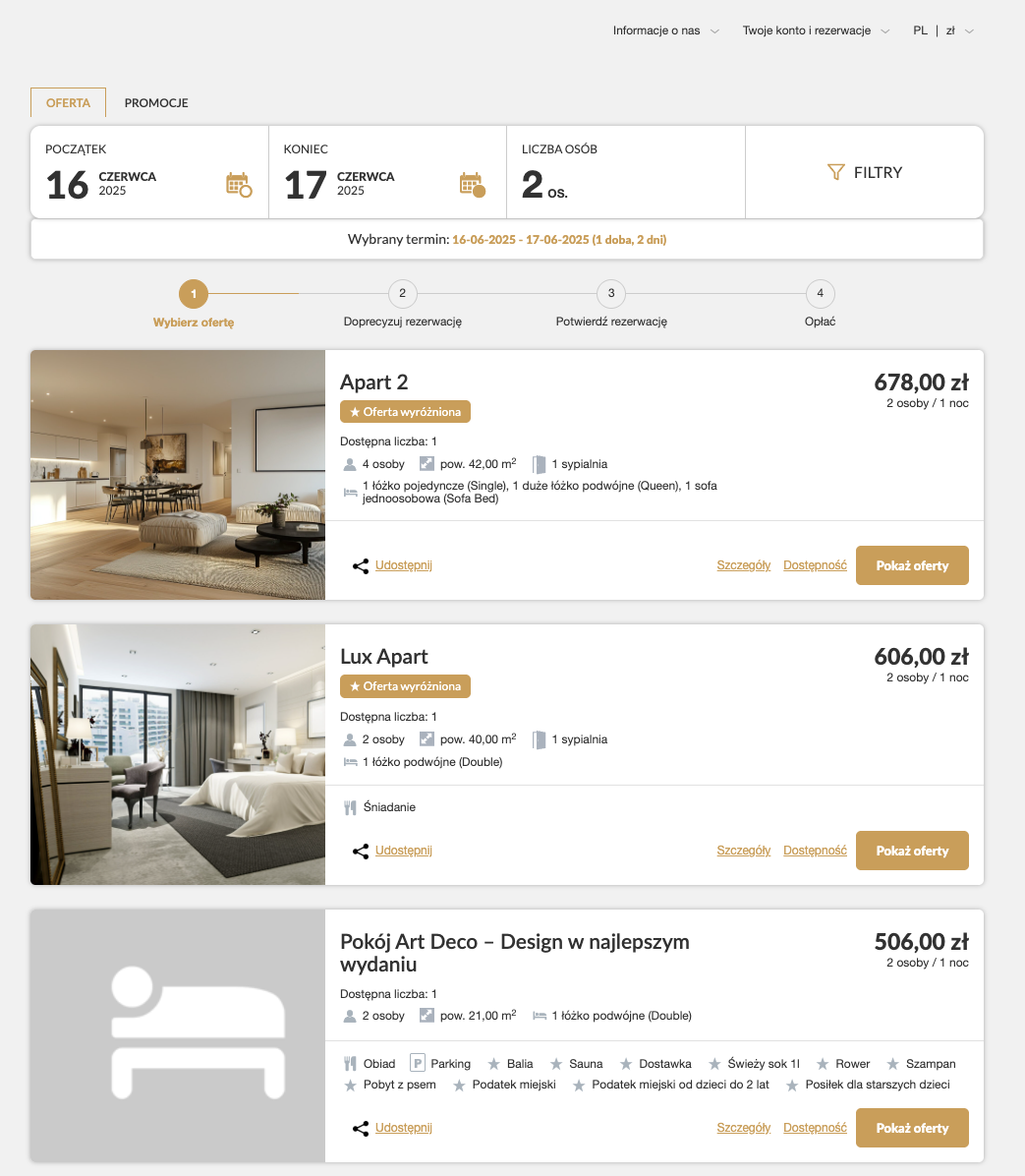 Wyróżnione oferty są automatycznie oznaczane etykietą „Oferta wyróżniona”, co zapewnia przejrzystość i spójność komunikacji dla gości.