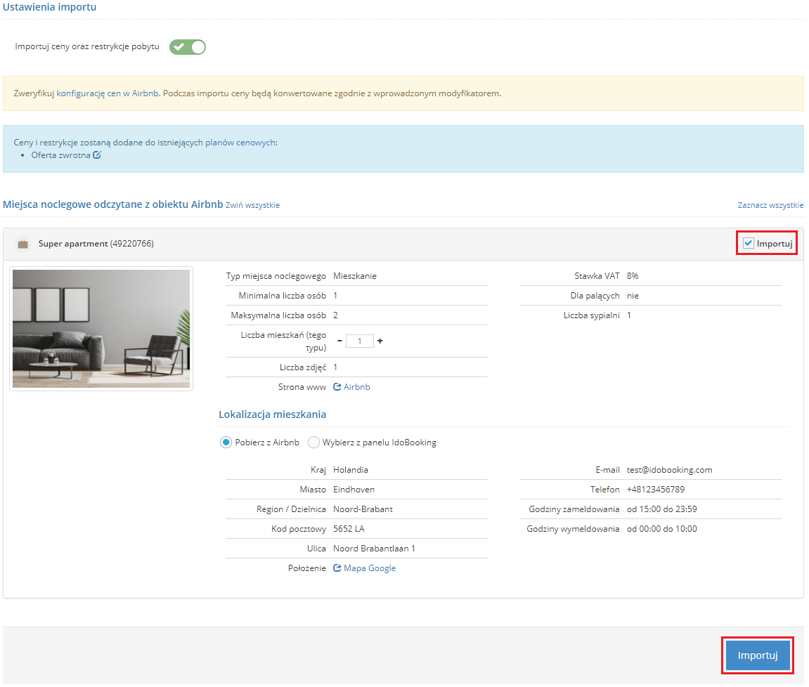 W tej chwili wszystkie powyższe informacje możesz pobrać bezpośrednio z serwisu Airbnb i automatycznie utworzyć integrację dla nowych obiektów w IdoBooking.