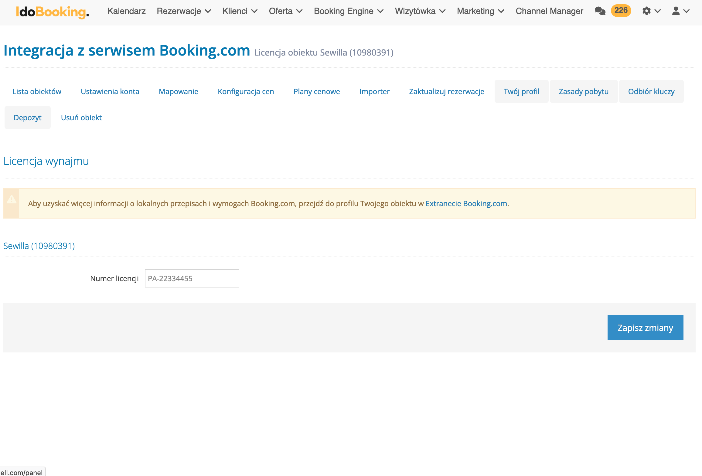 Licencje wynajmu - w zależności od kraju oraz lokalizacji, w której wynajmujesz obiekty, Booking.com może wymagać od ciebie doprecyzowania prawnych wymogów związanych z prowadzeniem działalności, np. prosząc o podanie licencji wynajmu. Obecnie to ustawienie nie dotyczy obiektów zlokalizowanych w Polsce.