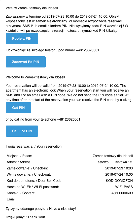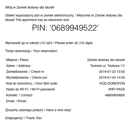 - Kody wysyłane są w pełni automatycznie: SMSem, mailem, poprzez dedykowany link www (osobny dla każdej rezerwacji!). W przypadku rezerwacji "last minute" kod wysyłany jest natychmiast bez jakiejkolwiek zwłoki