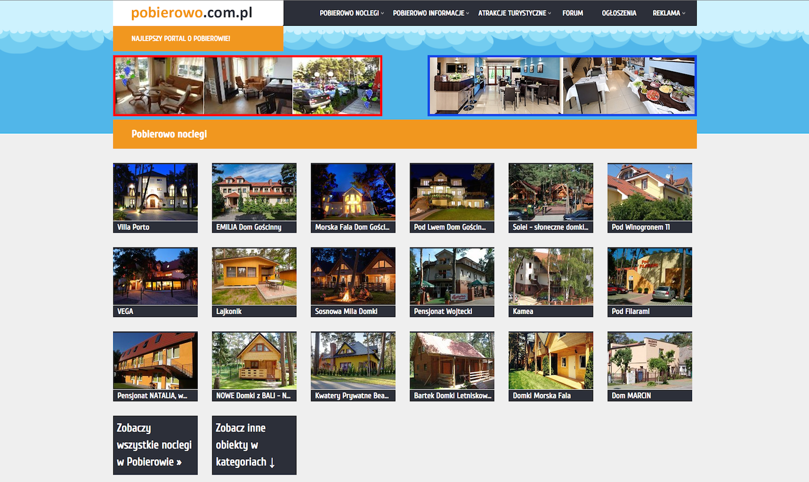 Pobierowo.com.pl jest odwiedzany przez ponad 300 000 osób rocznie. Zawiera przydaje informacje dla turystów planujących wypoczynek w Pobierowie: ważne adresy, zdjęcia i informacje o obiektach noclegowych. Jest bardzo dobrze wypozycjonowany w wyszukiwarkach internetowych, dlatego warto umieścić w nim swoją ofertę i zachęcić gości do bezpośrednich rezerwacji. Dzięki dużej liczbie odwiedzających stanowi dobre miejsce do zamieszczenia reklamy internetowej.