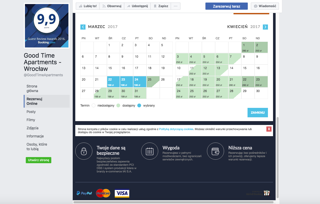 Użytkownicy Facebooka są również świadomi korzyści płynących z użytkowania Internetu, a - co za tym idzie - nie mają uprzedzeń do nowych rozwiązań oraz cenią sobie możliwość dokonywania rezerwacji noclegów online. Dzięki prostemu w obsłudze Kalendarzowi Rezerwacji (Widgetowi) zamówienie noclegu czy usługi możliwe jest wprost z portalu.