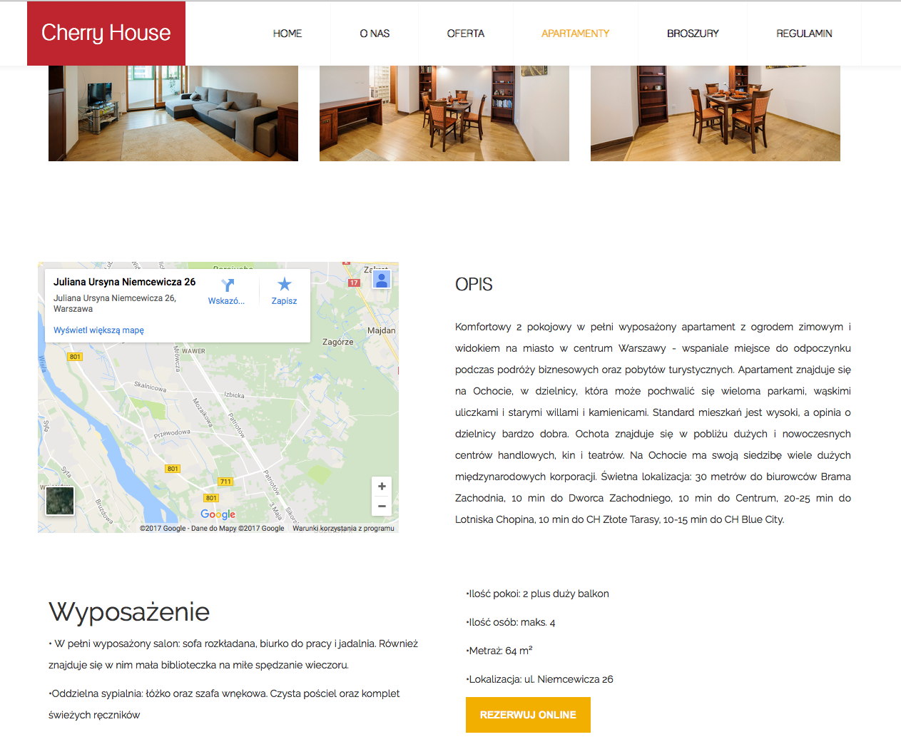 Przykład wykorzystania buttonu "Rezerwuj online" na stronie Apartamentów Cherry House