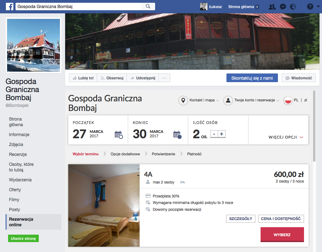 Wykorzystanie kalendarza rezerwacji na profilu facebookowym Gospody Granicznej Bombaj